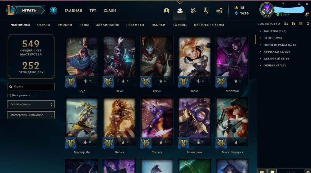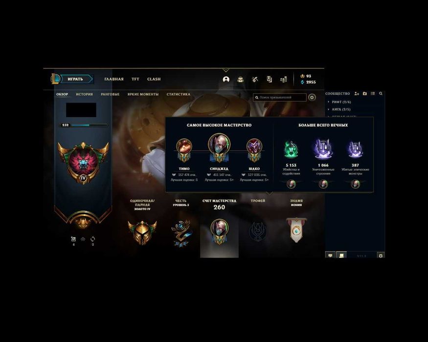 🌍Сервер: RU ⚡Уровень: 311 🛡Кол-во чемпионов: 155