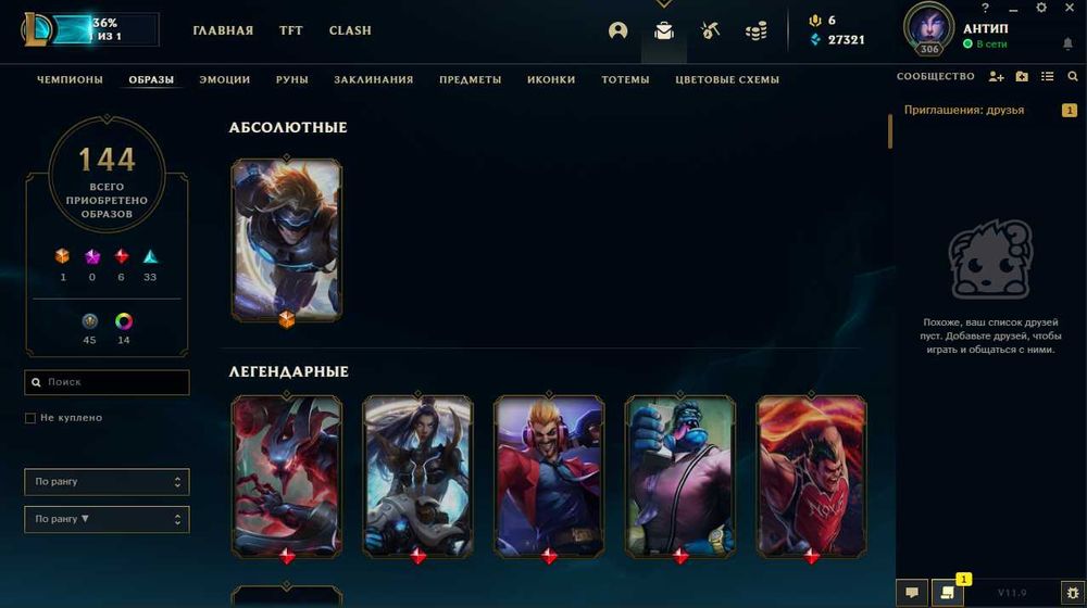 🌍Сервер: RU ⚡Уровень:182 🛡Кол-во чемпионов: 147 ✨Кол-во скинов: 50