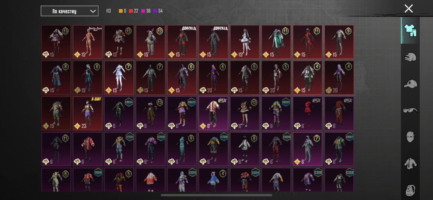 👚Топ костюмы: 65; ⭐️Royale Pass: с 5 сезонна; 🌈Скины на оружие: 36;